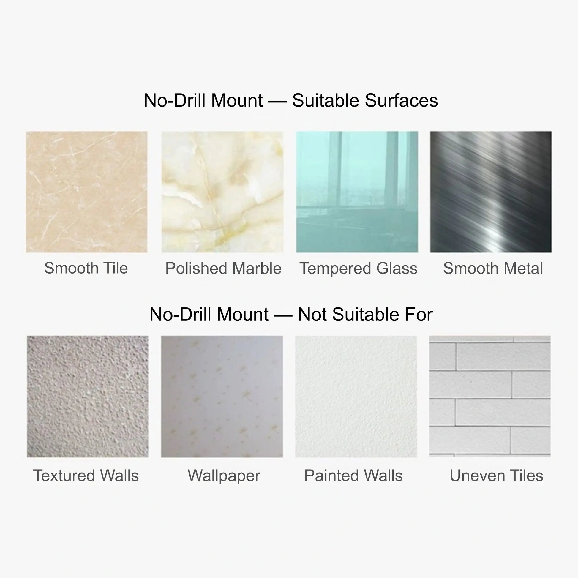 Adhesive mounting is suitable for smooth surfaces such as polished tile, marble, glass, or metal. Avoid using on textured or painted walls.