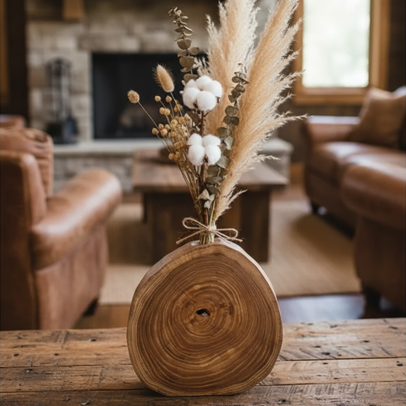 Elevate your home décor with this handcrafted log vase, made from solid wood with unique natural rings. Perfect for dried flowers, pampas grass, or cotton stems, it adds instant rustic charm to dining tables, coffee tables, or entryways. A true statement piece for farmhouse and boho interiors.